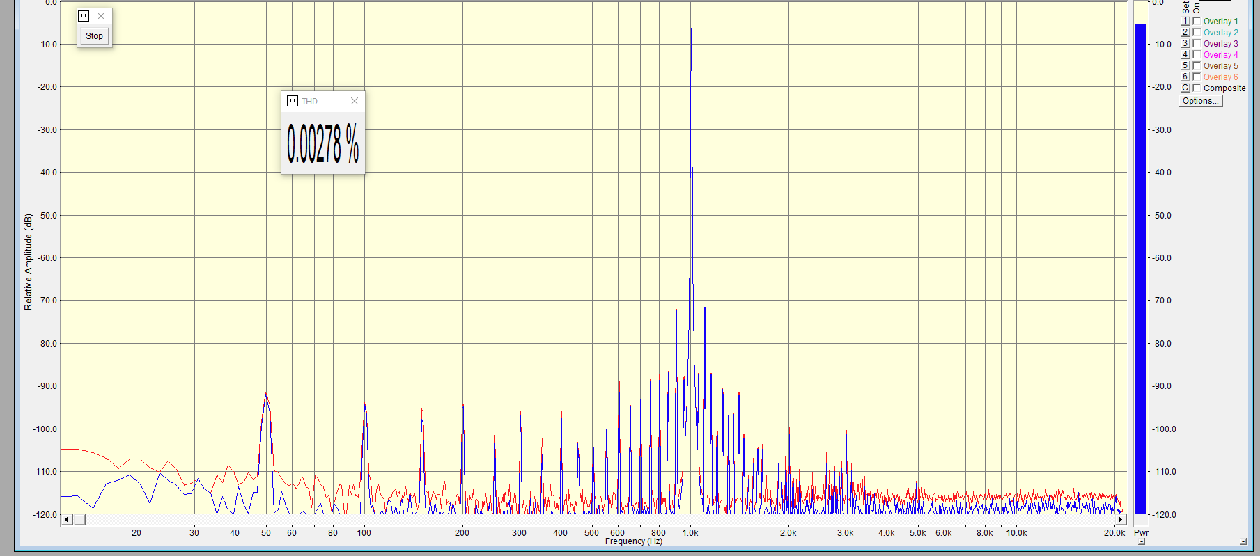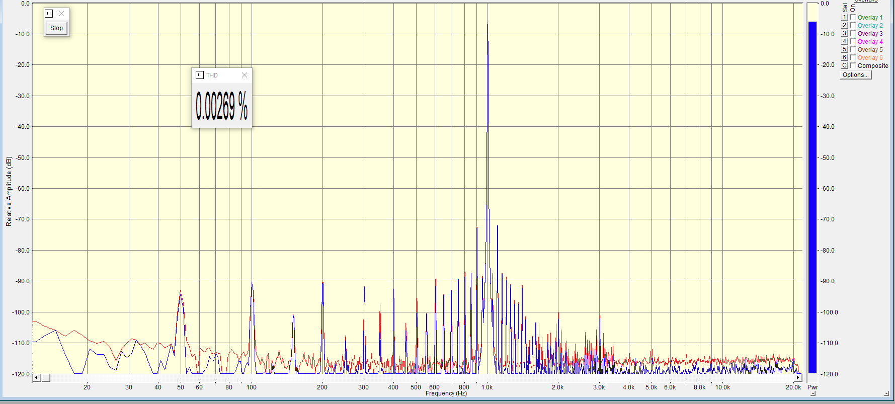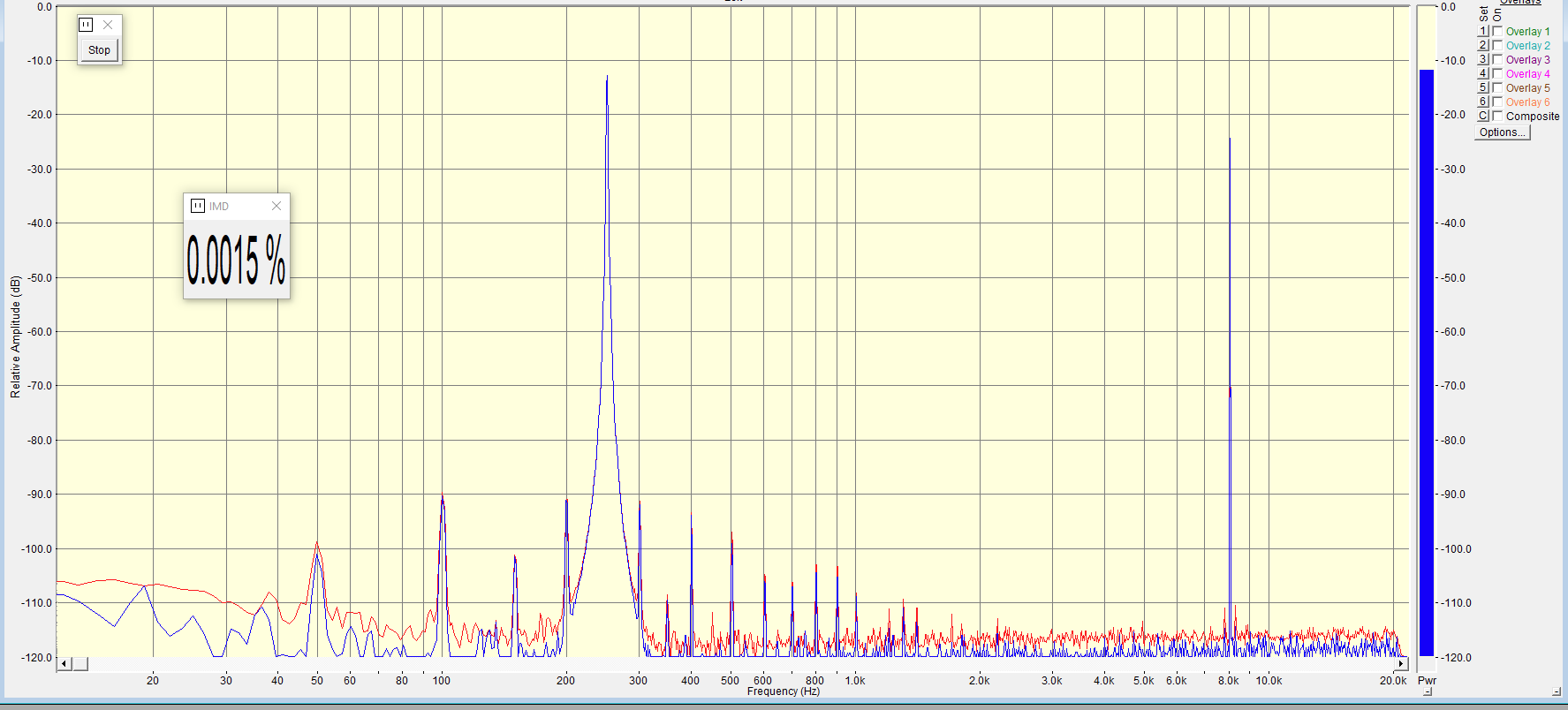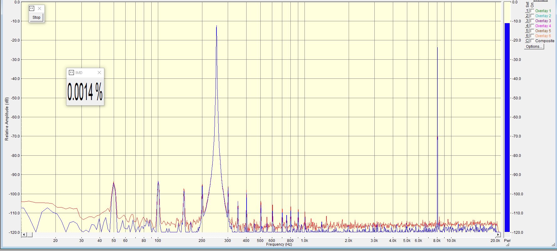 Po wykonaniu prac zaczęło to grać jak powinno, z prawidłową przestrzenią, barwą i klasą. Dla pewności wykonałem pomiary zniekształceń harmonicznych i intermodulacyjnych (THD oraz IMD – patrz obrazki) – wyszły lepiej niż producent przewidział. To tak dla pewności, by nie ulegać autosugestii. Wiadomo, kupa godzin pracy przecież musi dać pożądany rezultat 🙂